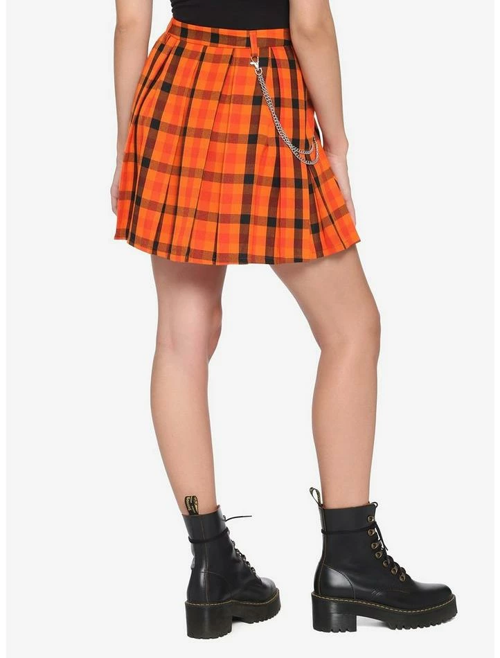 OrangeΒ you glad we released this skirt in time for Halloween? Time for a pumpkin patch and a hay ride in this adorable orange pleated plaid skirt, featuring removable chain, belt loops and side zipper closure.