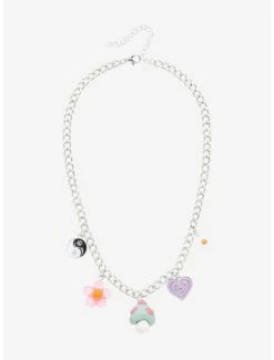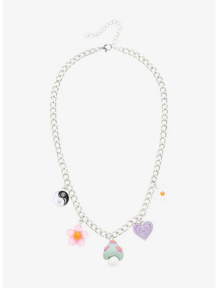 Keep your outfit groovy with this charm necklace! This whimsical silver-tone necklace features charms of pastel flowers, hearts and mushrooms, and a flowery Yin-Yang symbol.
