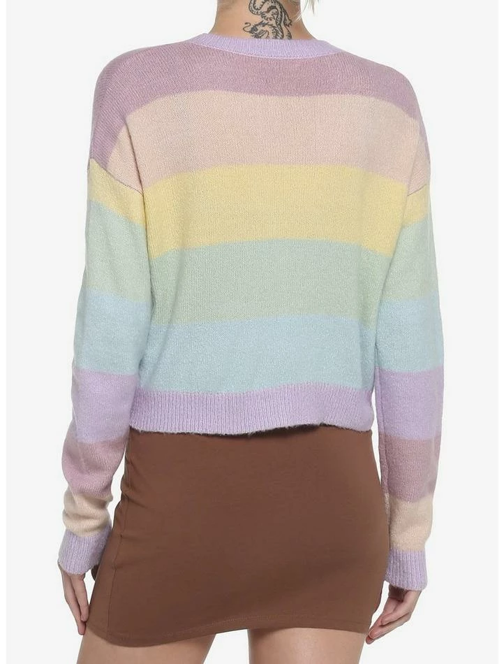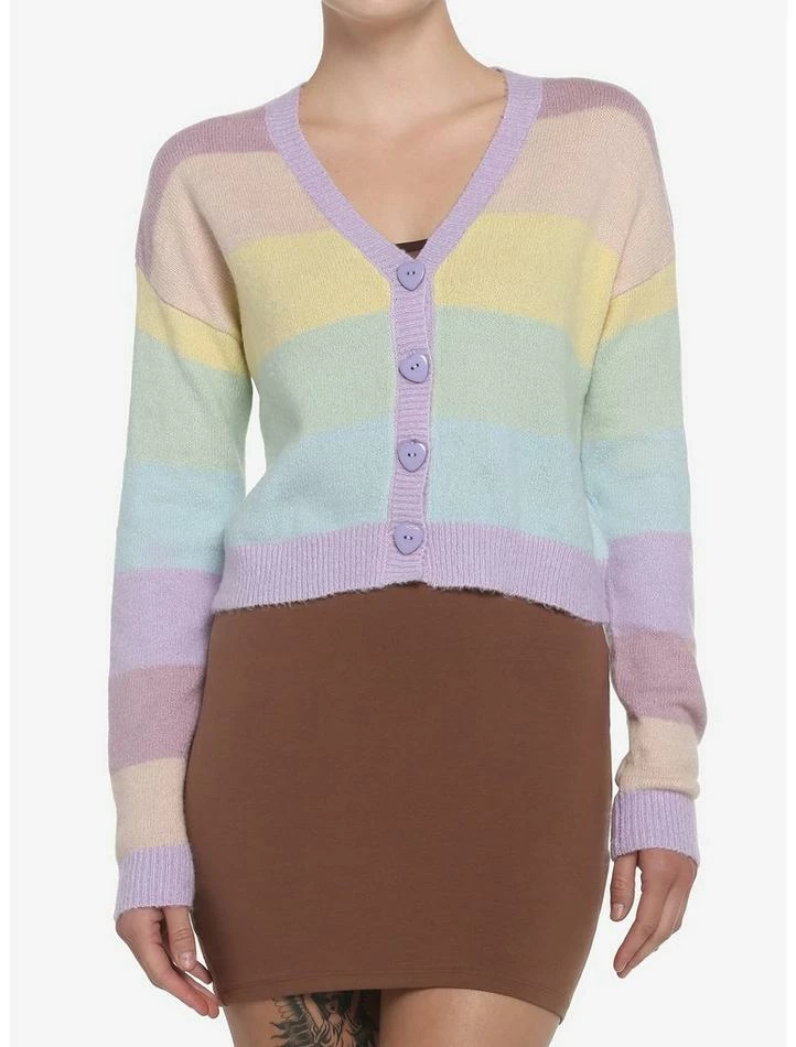 Soft girls, this one’s for you. It’s a cropped cardigan in a pastel rainbow knit that just screams cute and cozy. It even has four pastel purple, heart-shaped buttons.