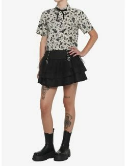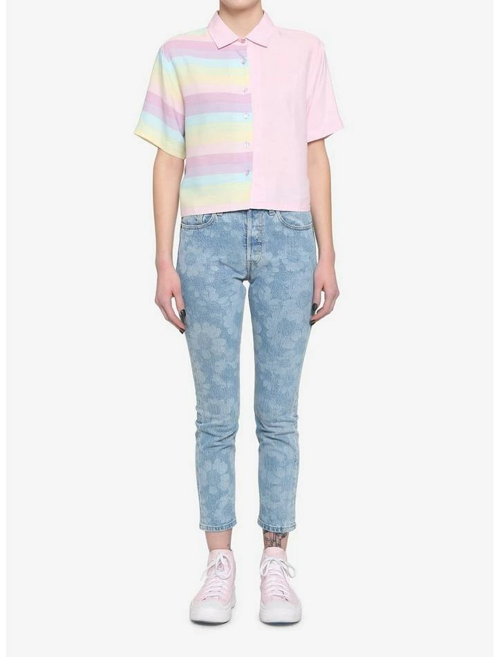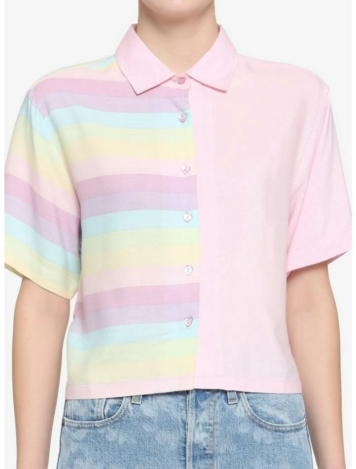 Love color? Then this cropped button up is just for you! It has a boxy fit and features a light pink and pastel rainbow stripe split design, complete with adorable heart-shaped buttons. Perfect for your spring wardrobe!