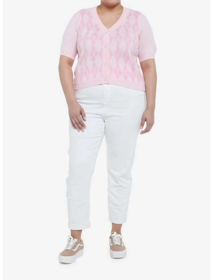 Sweeten up your next ‘fit with this cropped cardigan. It features an argyle pattern in pastel and baby pinks, plus heart-shaped buttons.