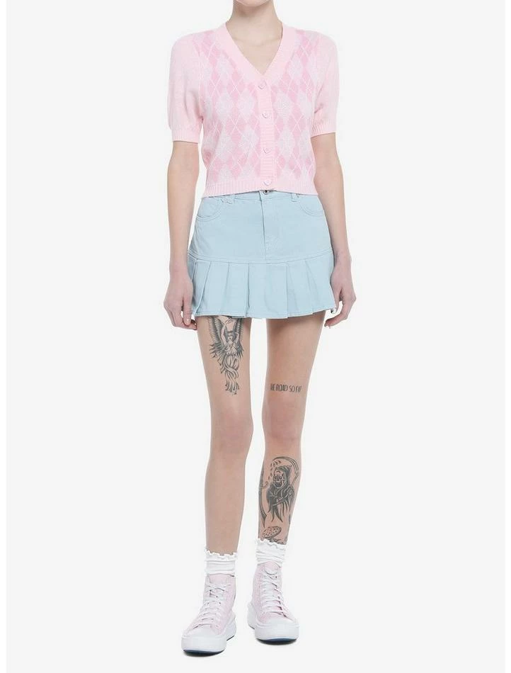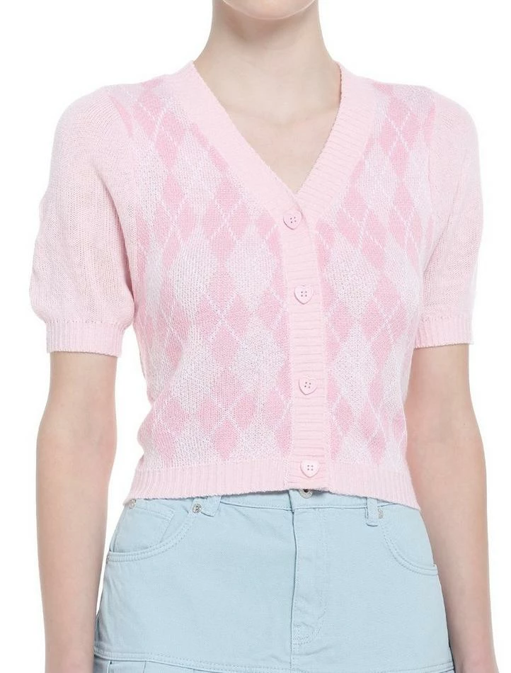 Sweeten up your next ‘fit with this cropped cardigan. It features an argyle pattern in pastel and baby pinks, plus heart-shaped buttons.
