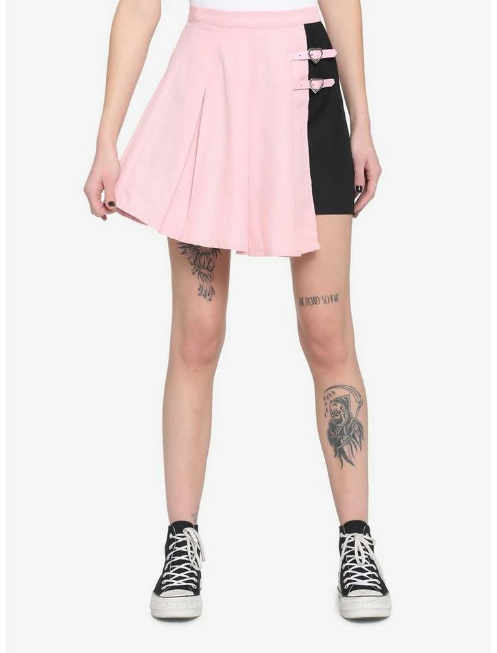 Add some dimension to your wardrobe with this pink and black skirt. The asymmetrical silhouette makes this skirt as unique as you are! There is double buckle detailing with silver-tone heart-shaped hardware. Side zipper closure.