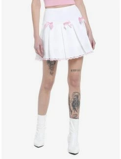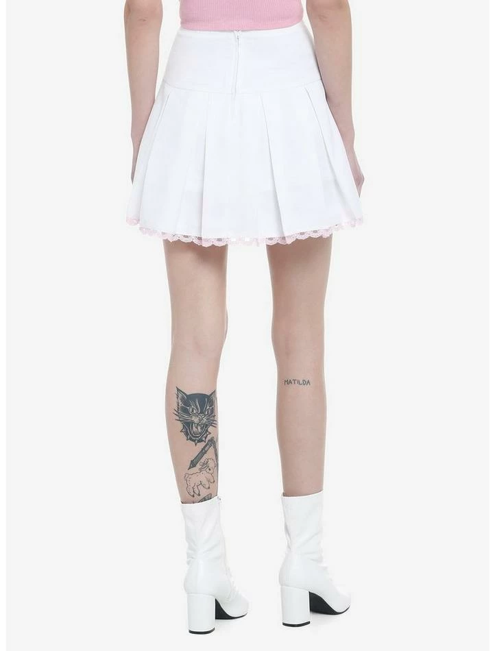 Step out in some kawaii style with this adorable skirt on! This white skirt comes with dainty pink satin bows across the yoke, with box pleats and matching pink lace trim underneath.