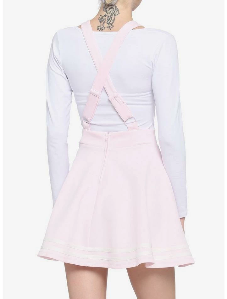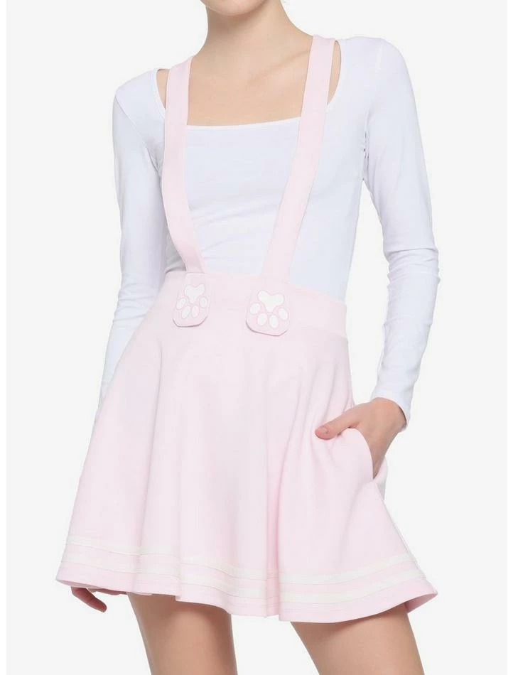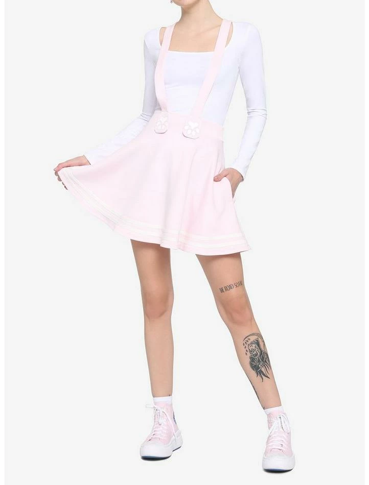 Look paw-some in this kawaii skirtall. It comes in the softest pastel pink with cat paw prints on the front suspender tabs and white appliquΓ© stripes at the bottom hem. Pockets and adjustable straps.