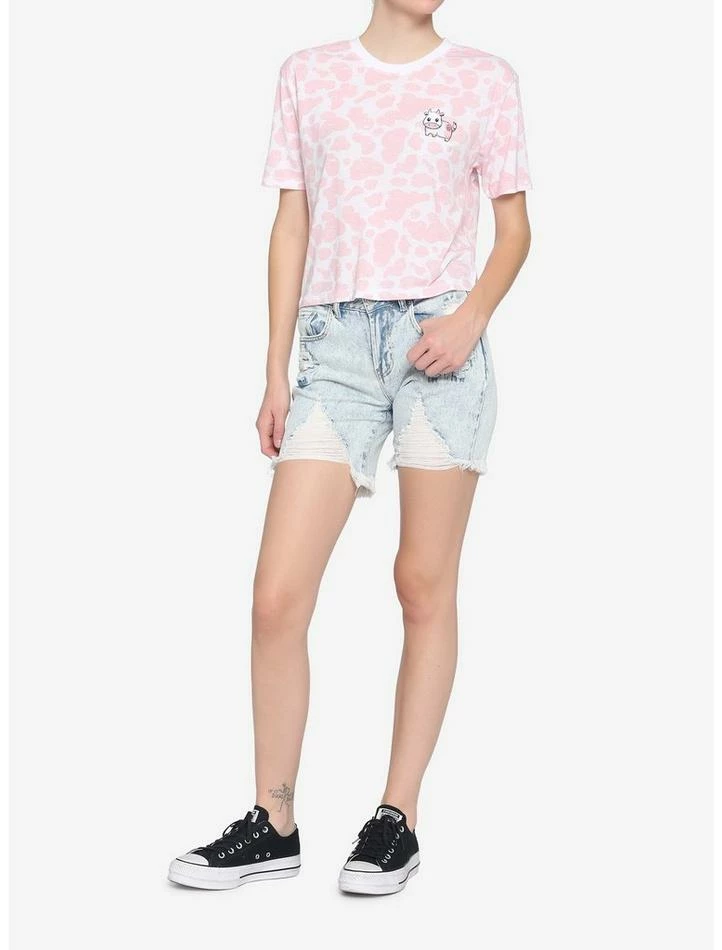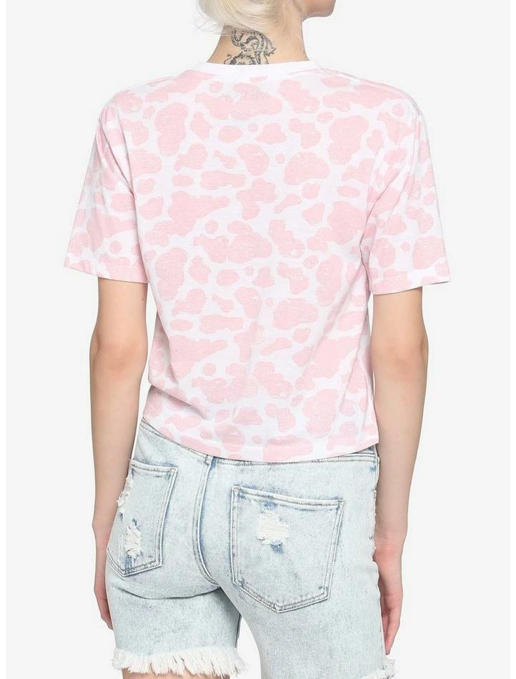 Ready for a legen-dairy look? Grab this boxy, crop tee featuring a pink cow print and embroidered pink cow with strawberry on the left chest.