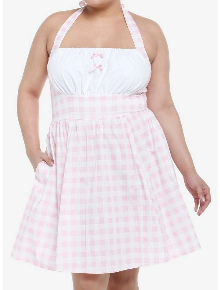 Look sweet as pie in this mini dress! It has a pink gingham print with satin bows on the bust and a halter neckline that you tie. There are also pockets.