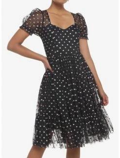 You’ll have heart eyes for this dress! This lined dress features a tulle overlay with an allover pattern of pink glitter hearts. Tiered layer at the bottom, satin tie-back ribbon and sheer puff sleeves. Side zipper closure. No pockets.