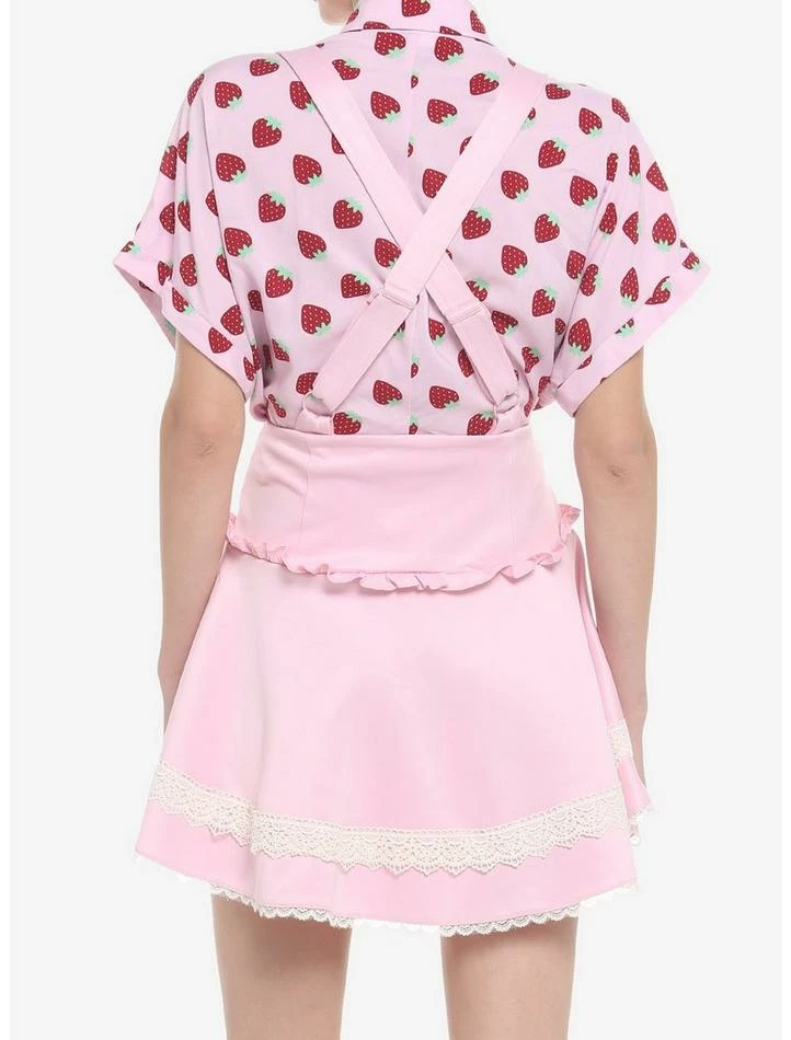 This supersweet suspender skirt will give you your sugar fix! It has heart-shaped faux buttons and a heart-shaped waist band, plus ruffle and lace detailing.