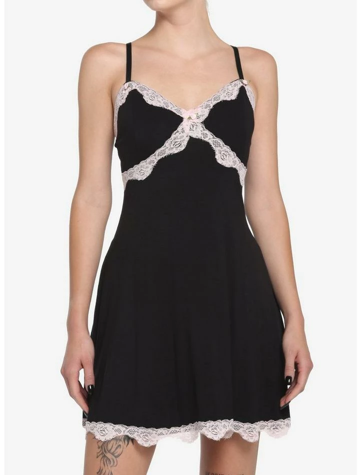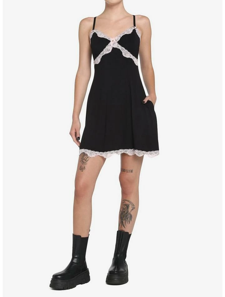 Slip into something cute and classy! This black slip dress is perfect for when you want to add a daintier touch to your usual LBD. Features pink lace trim across the chest and on the hem, with pink roses adorned at the center chest and under both straps. Comes with princess seams, adjustable cami straps and side pockets!