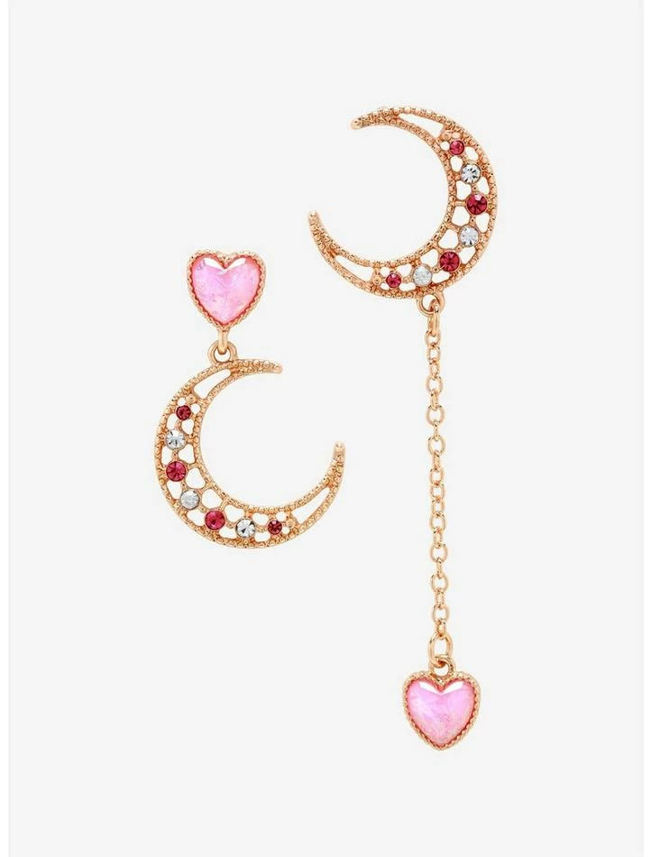 Who says earrings have to match to look cute? This set of earrings features the same crescent moon charm on both, with one dangling from a heart shaped stud and the other with a matching heart charm on a chain. Accented with pink and clear gemstones.