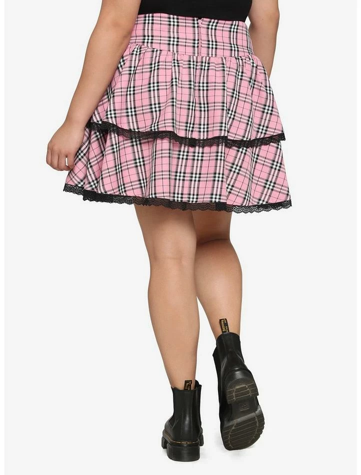 Pretty in pink! This skirt features a pink, white and black plaid, black lace trim, black lace-up detailing on the front and back zipper closure.