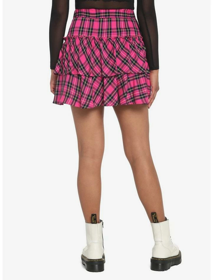 Your outfit’s missing some prep! Add a pop of color to your skirt collection with this plaid number, featuring a magenta plaid design on a tiered skirt, complete with ruffles under the wide yoke and an elastic waistband.ย
