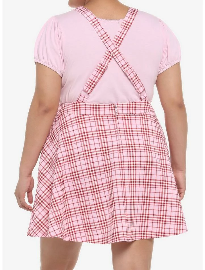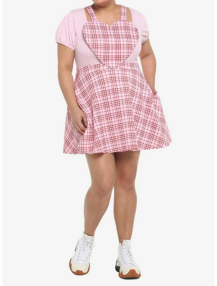 We heart a skirtall moment. This red-and-pink plaid style has a heart-shaped front panel, adjustable straps and pockets.
