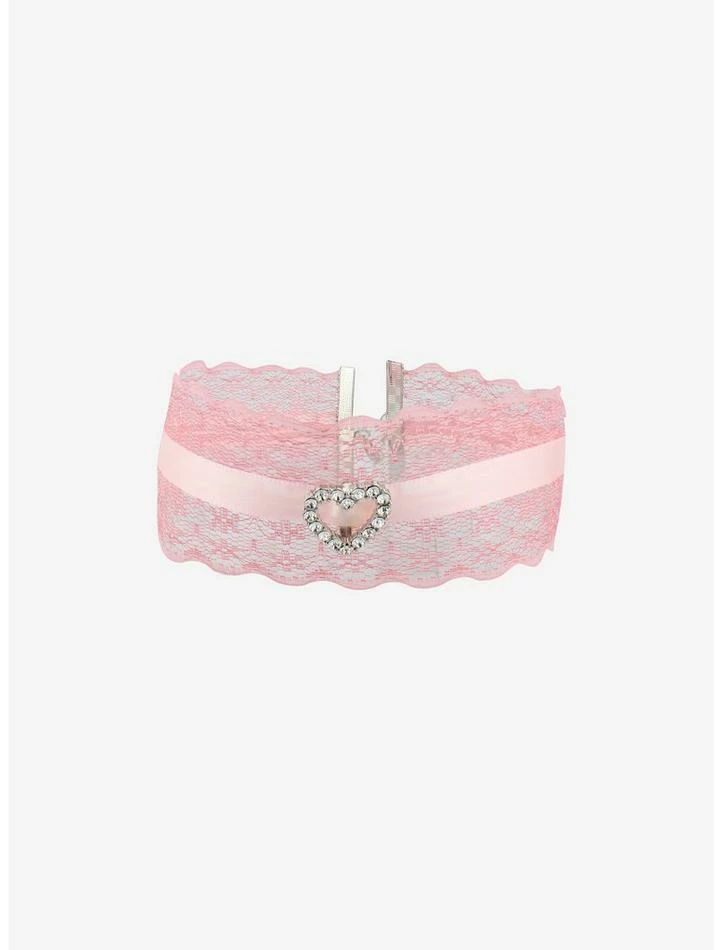 Add some extra love to your outfit with this adorable choker! This pink lace choker is perfect for any kawaii look, and features a satin pink ribbon in the center with a rhinestone heart in the middle.