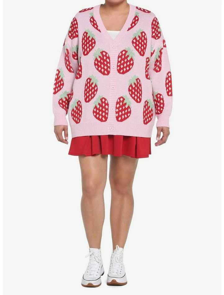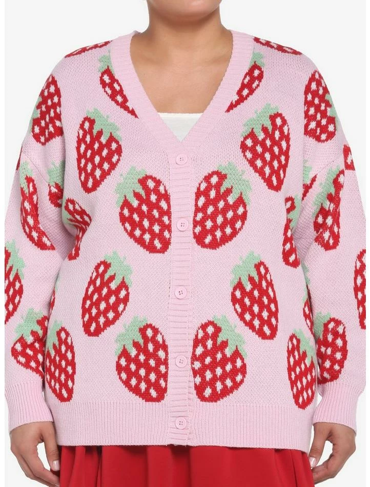 You know when you bite into the ripest homegrown strawberry, and it’s just so yummy? This cardigan will make you feel the way that strawberry tastes! Sweet as can be, this button-down pastel pink cardigan features an allover toss pattern of large strawberries. Plus, the slight oversized fit will keep you cozy all day long!