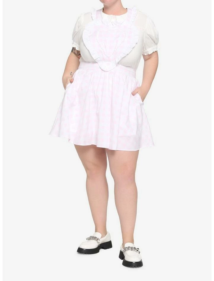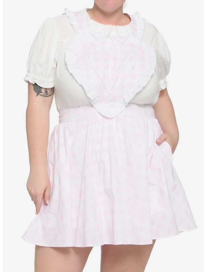 Frill up your skirtall game with this lil’ number! This woven skirtall has a pink and white buffalo plaid print with a heart-shaped bib. There’s ruffle detailing on the straps and bib, side seam pockets and straps with two button adjustments. Back zipper and hook-and-eye closure.