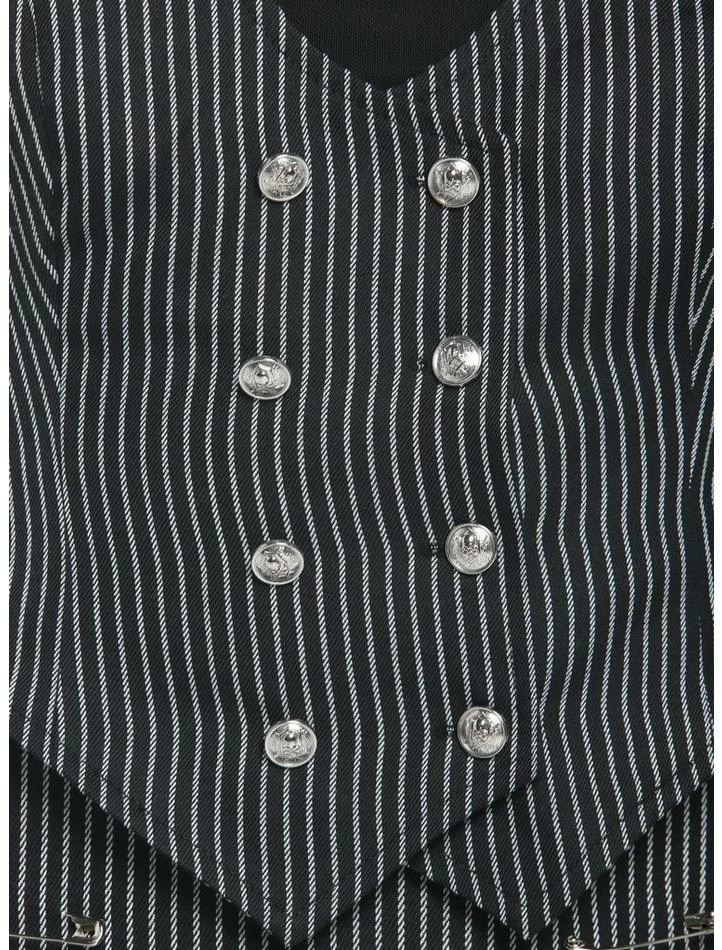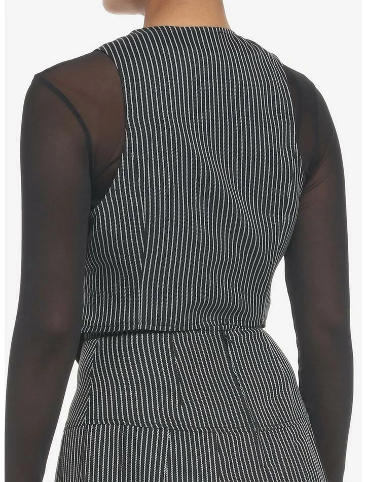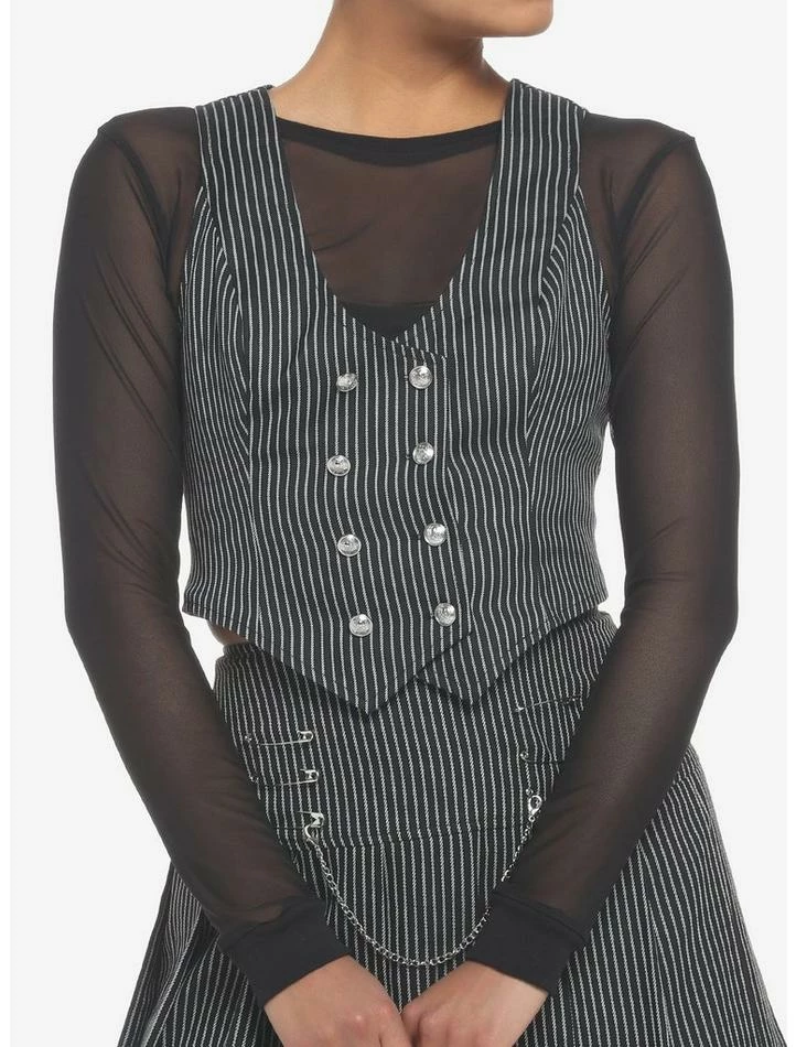 This vest is preppy but with an edge. Pinstripes make up the preppy vibe, but the cropped cut and skull crest buttons on the front are what give it that Hot Topic je ne sais quoi.