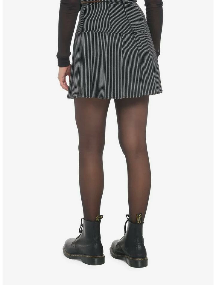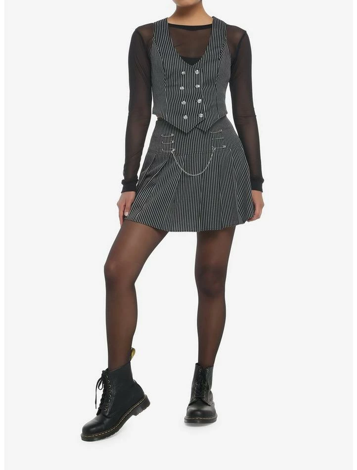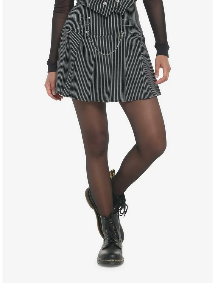 This skirt is preppy but with a sharp edge. Pinstripes and pleats make up the preppy vibe, but the safety pins and chain on the front waist are what give it that Hot Topic je ne sais quoi.