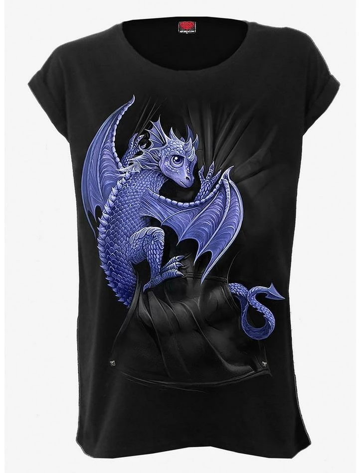 Nestled in the warm comfort pouch of his mother?s pouch, this little guy is ready to scale the dizzying heights while spewing forth brimstone and spreading his wings wide. But for now, he must rest and learn from his mentor, for he is but a pup. One day he will be a King. This capsleeve tee is made of jersey using skin friendly, Azo-free, reactive dyes.