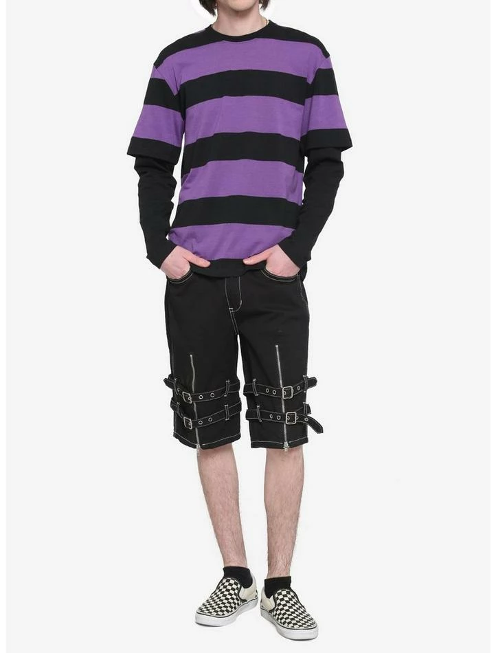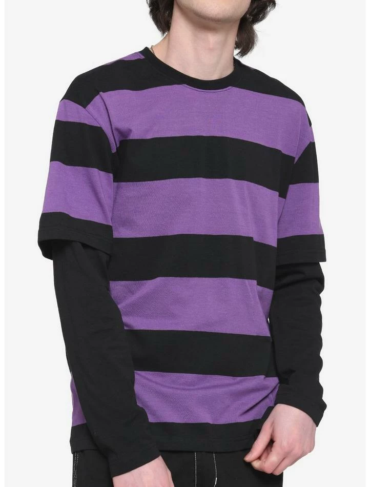 Time for a tee that kicks it up a notch. This one features purple and black stripes and black long sleeves.