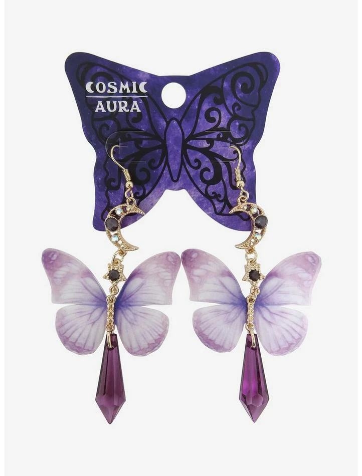 Channel serious celestial energy with this gorgeous pair of earrings. These gold-tone, drop earrings will make you one with nature. Featuring purple butterfly drops, with faux crystal and celestial-themed charms.
