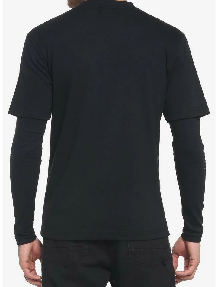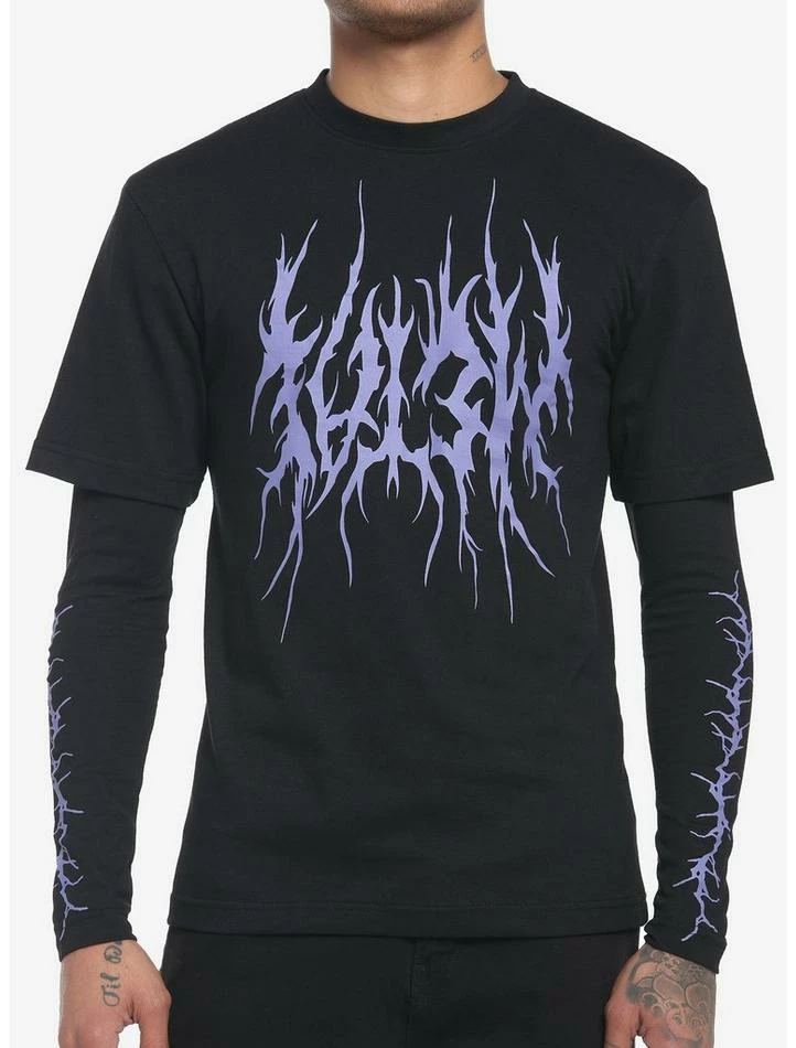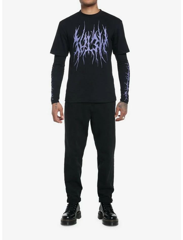Keep it edgy in this twofer long-sleeve tee. It’s all black with purple heavy metal font reading “METAL” upside down on the chest, plus graphics down the sleeves.