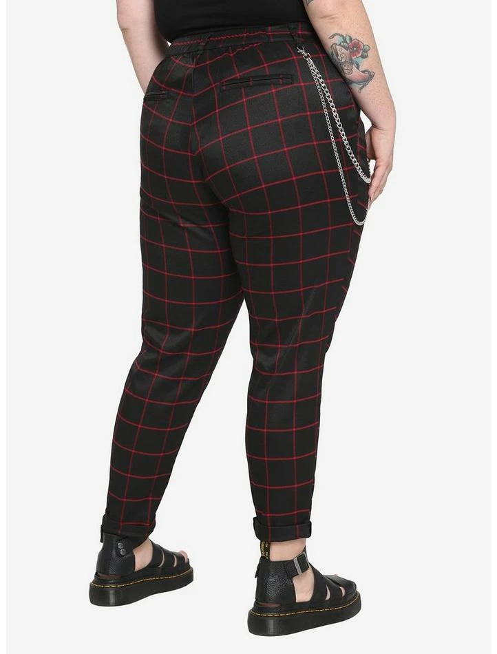 Add some extra punk vibes to your outfit with this pair of trouser pants! We’re upgrading from the typical black pants by adding a wide red grid all over. Comes with a removable, double layer chain, elastic on the back of the waistband and side pockets.