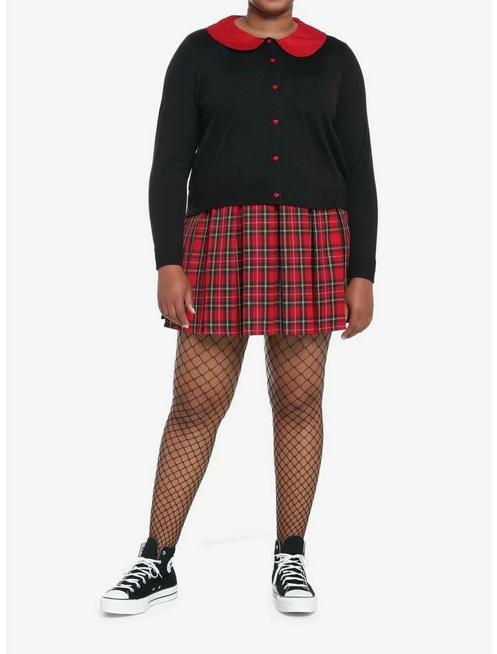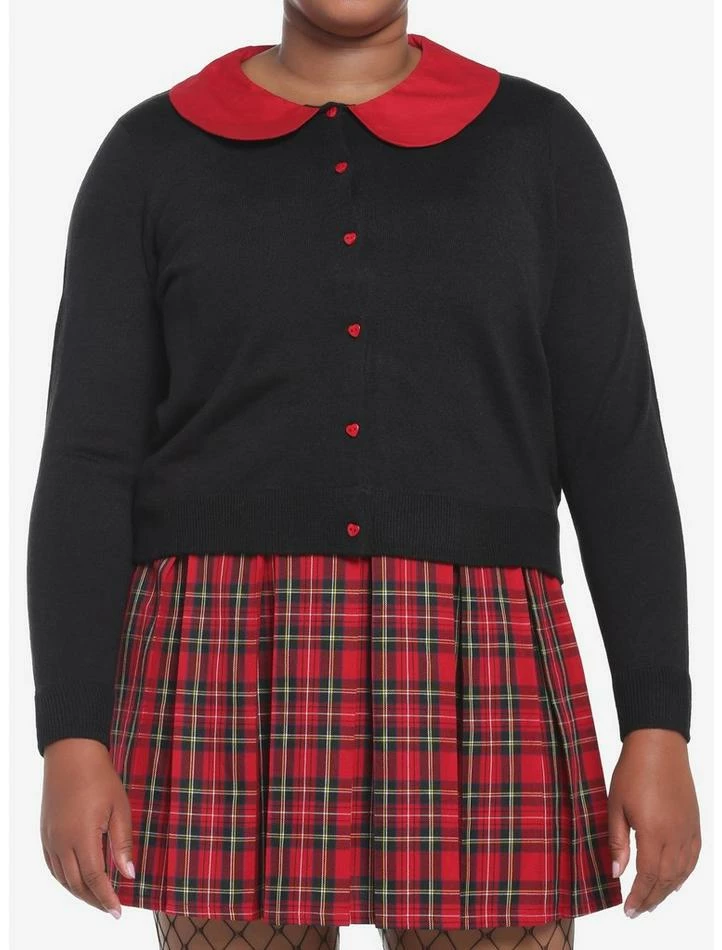 Add some heart to your wardrobe with this classic cardigan! This cropped cardi will add some love to any look, and features red heart-shaped buttons down the center with a matching red peter pan collar.