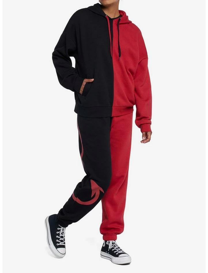 Let your horns out in this hoodie featuring a red and black split design with horns on the hood.