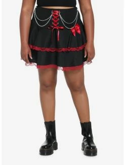 Add some classy punk vibes to your wardrobe with this tiered skirt! Keep it cute with the red ribbon lace-up detail down the center and red lace trim, or add a gothic twist with the removable layered chains. Back zipper closure.