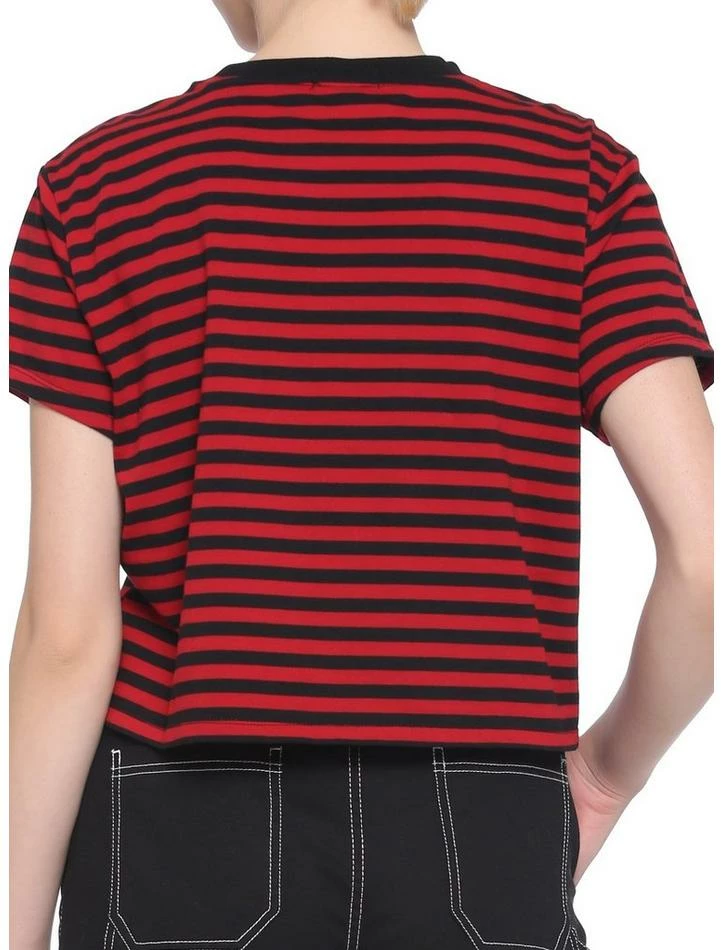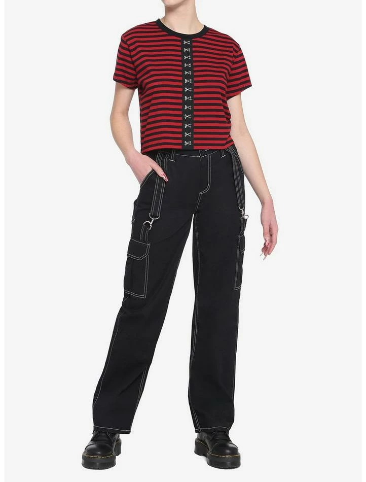 Classic HT never goes out of style. This top features black and red stripes, hook ‘n’ eye detailing down the front, boxy fit and cropped length.