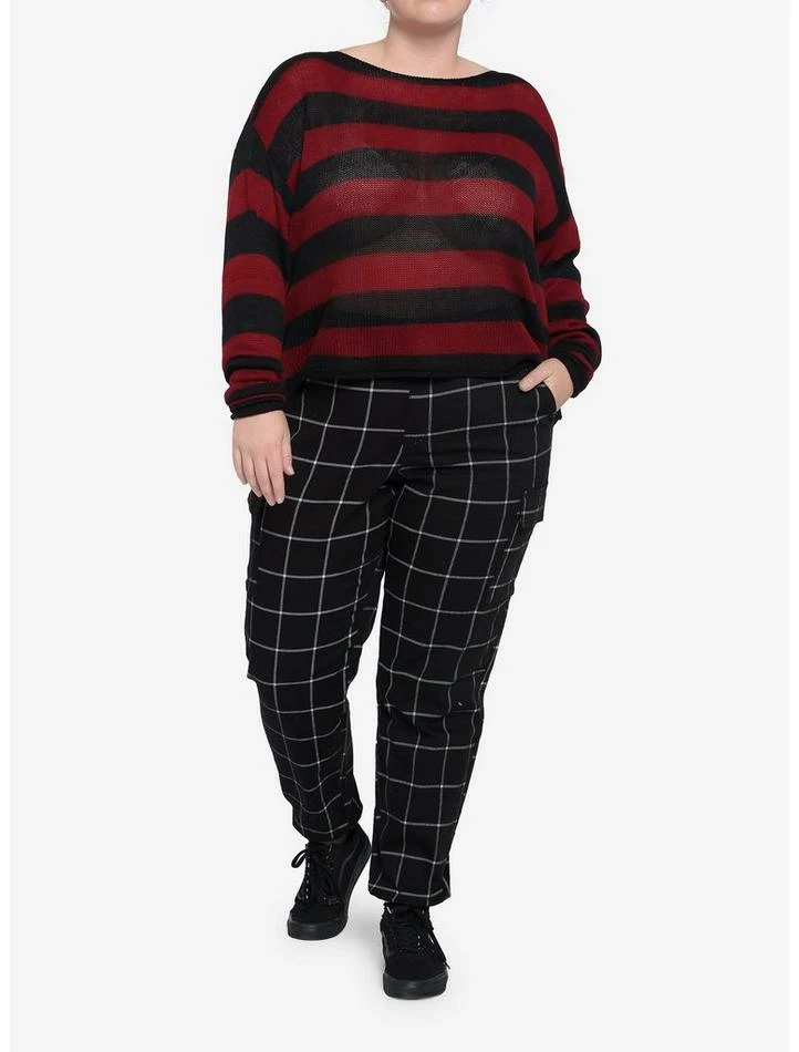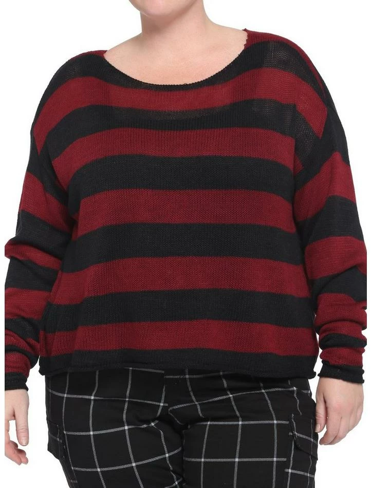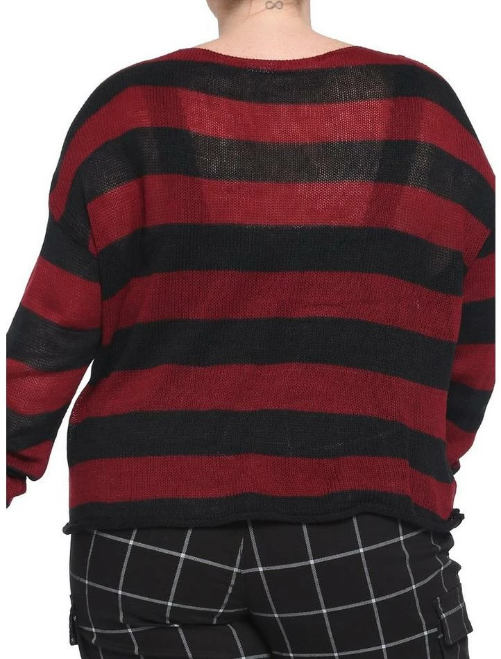 Meet your new favorite layering piece! This lightweight sweater features red and black horizontal stripes and a cropped length.ย