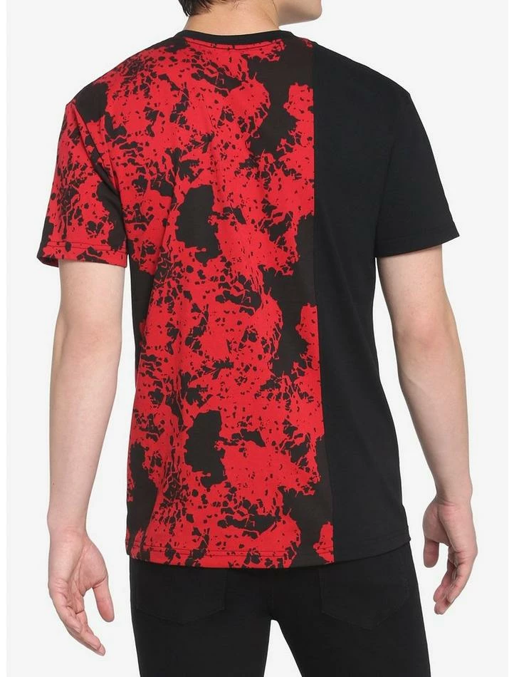 Time to add more tees into your rotation. This one features a solid black and red and black tie-dye side split design.
