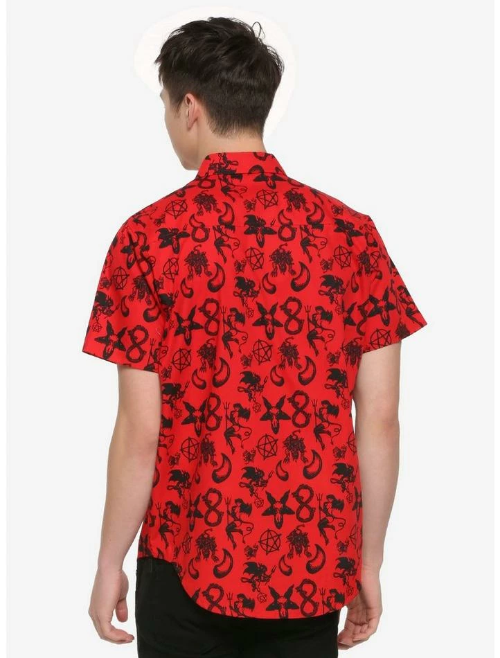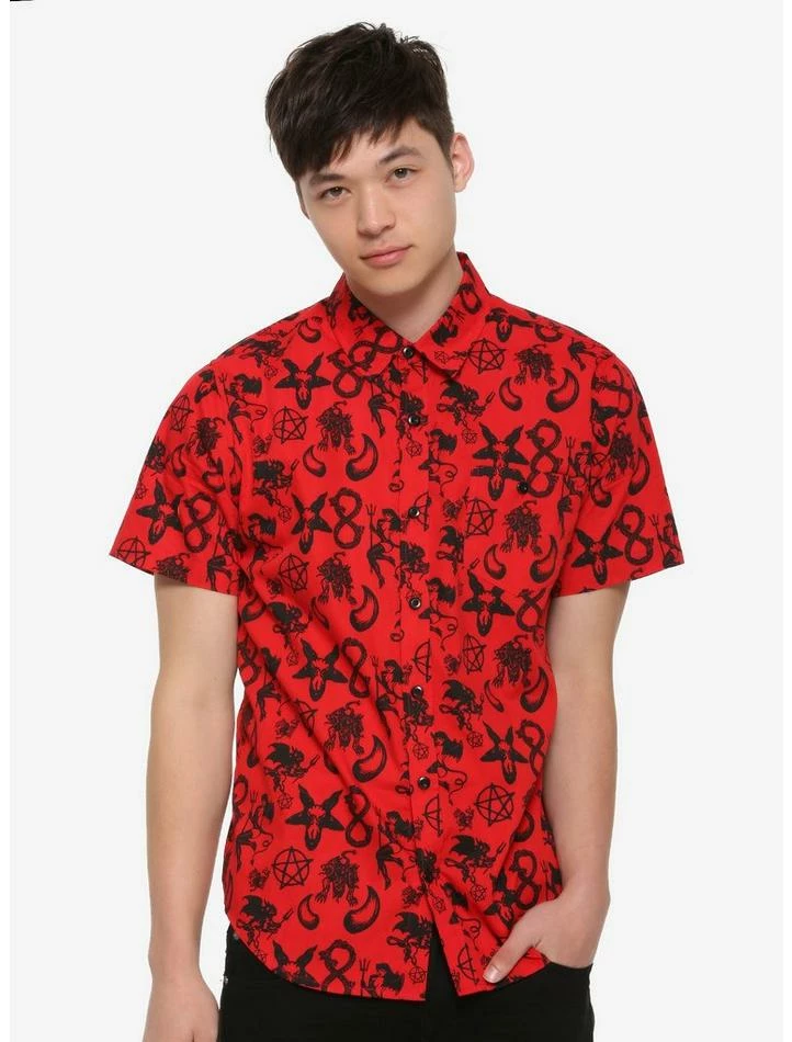 You devil, you! You’ll look like you’ve sold your soul to the Dark Lord in this bright red woven button-up, which is printed with all sorts of blasphemous imagery, such as the Baphomet, pentagrams, three-headed wolf demons and more. Features a chest pocket with a button closure.