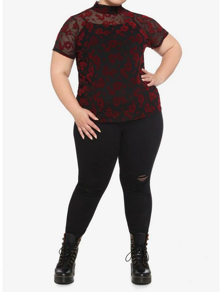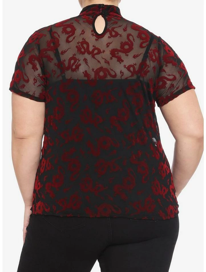 Get fired up with some dragons in your look with this black and red top. The black mesh features a design of flocked, red dragons all over with a button closure at the back of the mock neck. The strappy black tank top under layer features adjustable straps and can be removed.