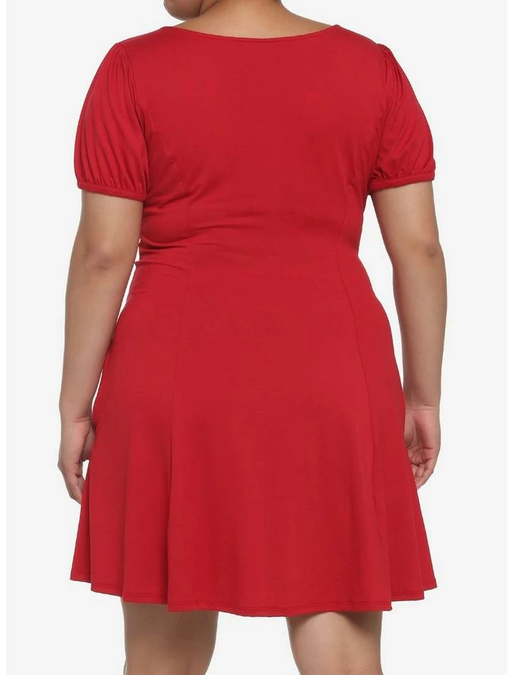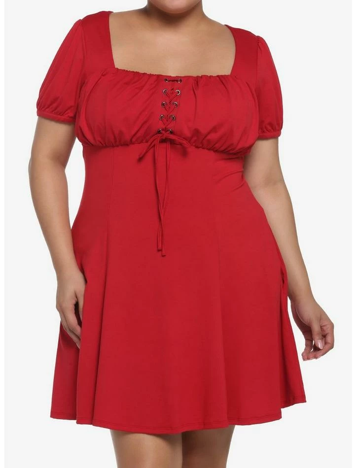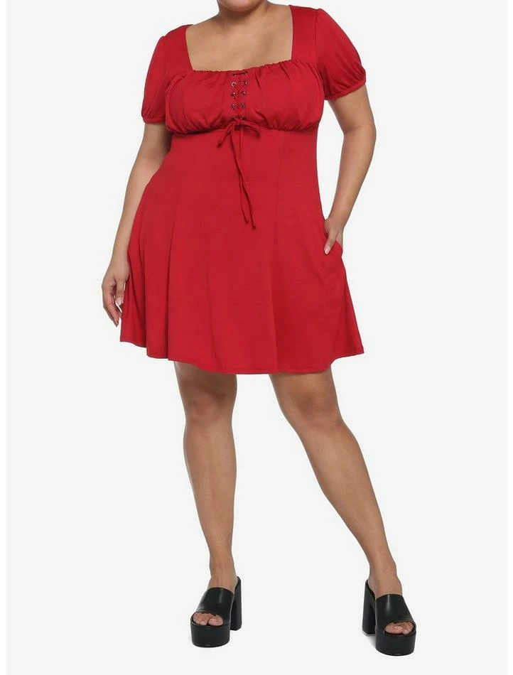 Everyone needs a red dress for the holidays and celebrations. This style has an empire waist with cute lace-up detail at the bust, and pockets!