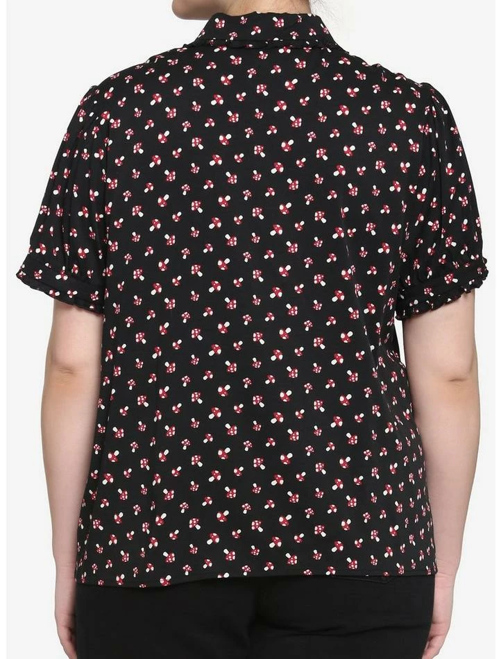 Keep your cottagecore look going with this black woven button-up featuring a red mushroom print, puff sleeves, tie at the collar, ruffle detailing at the collar and sleeves and heart-shaped buttons.