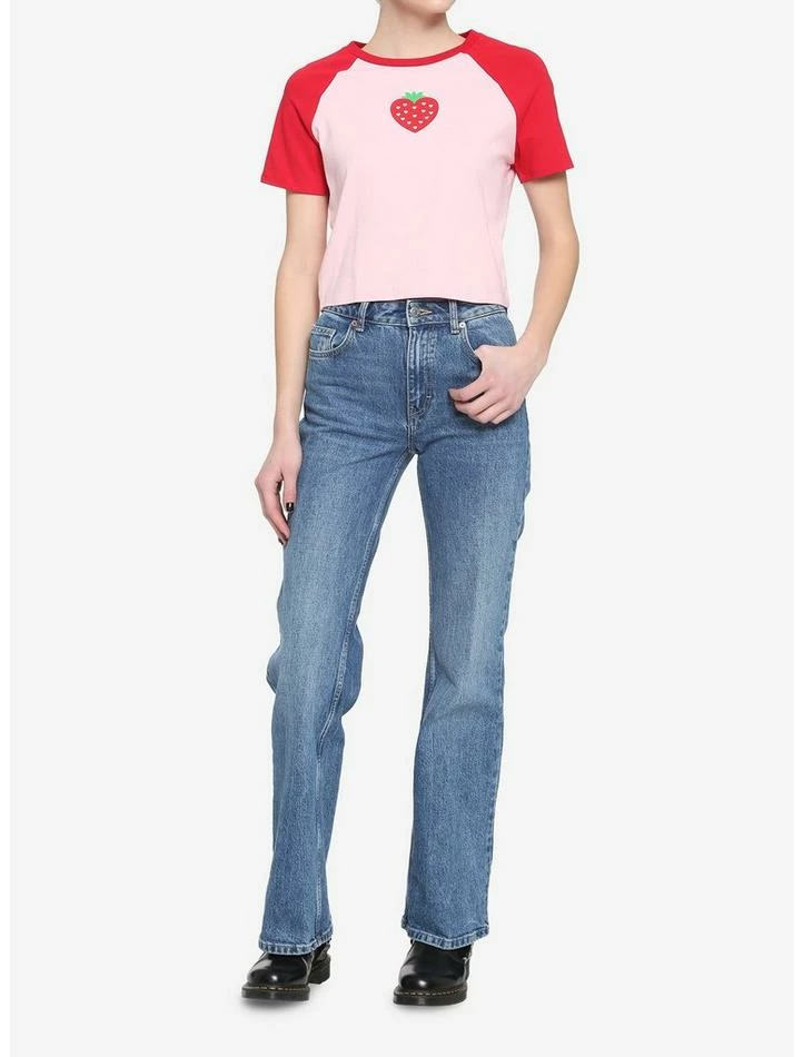 We’re berry certain you need this cute cropped tee in your wardrobe! This tee features a graphic on the chest of a strawberry with heart-shaped seeds. It has a raglan design with a pink body and red sleeves. Adorbs!