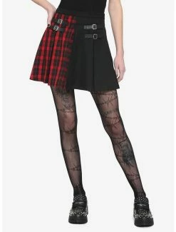 ย Be a scene queen in this skirt! It features black and red plaid split detail, with faux buckles on each hip.