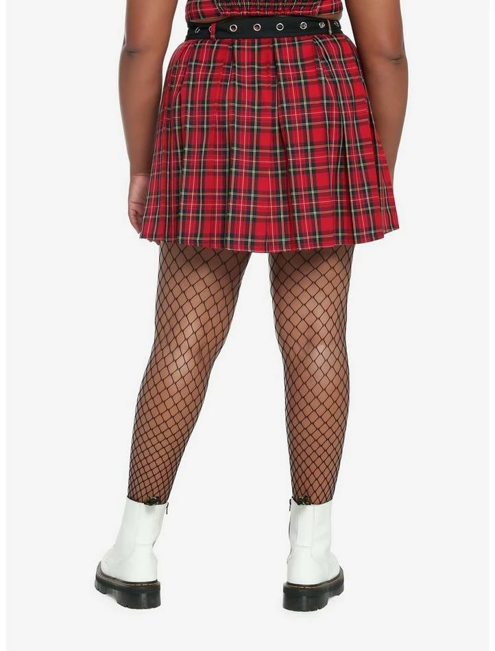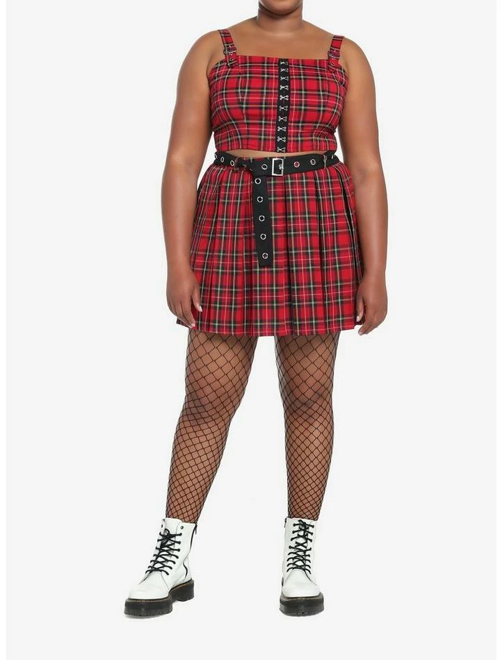 We’re mixing prep and punk together to bring you this statement skirt! Step out in style with this pleated skirt, featuring a red plaid design all over with a removable black grommet belt.