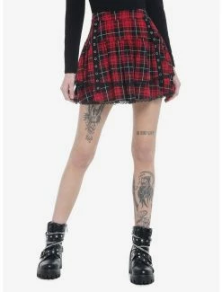 A must for every emo girl’s closet? A red & black plaid skirt! We’re elevating that essential with this tiered skirt, featuring a red & black plaid pattern all over with black lace trim across both tiers. Comes with grommet strap details down the sides for a punkish vibe.