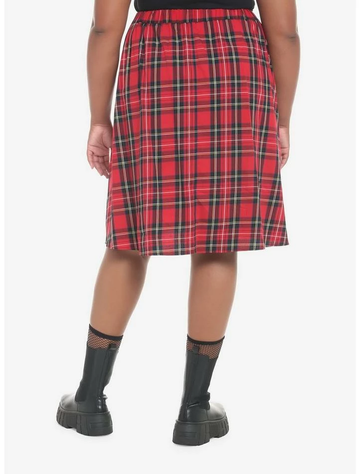 Amp up your holiday look with plaid. This midi skirt has an almost retro-style silhouette, pockets and elastic at the back waist for a perfect fit.