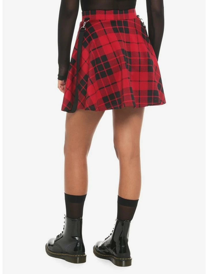 Plaid is always rad. This skater skirt features a black & red plaid print with an O-ring zipper in the front. There are side seam hip pockets, elastic waistband and detachable elastic suspenders.