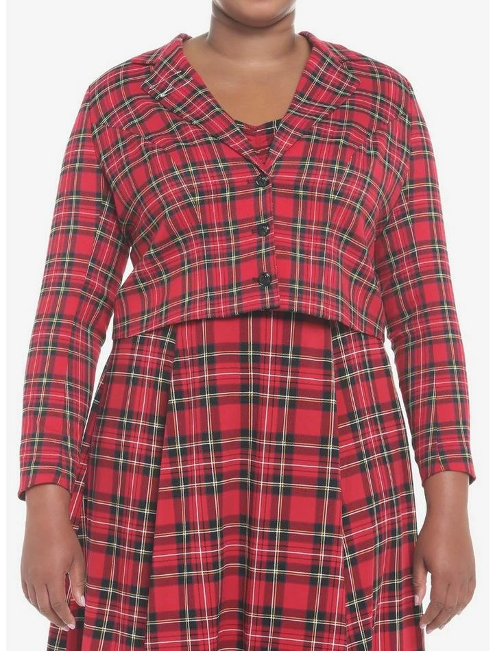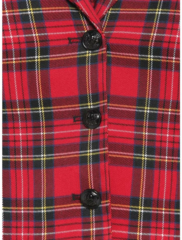 What happens when you mix punk and prep? This blazer is born! Add a statement piece to your wardrobe with this cropped blazer, featuring a red plaid pattern with safety pin detailing at the notched collar. Comes with skulls embossed on the buttons and padded shoulders.