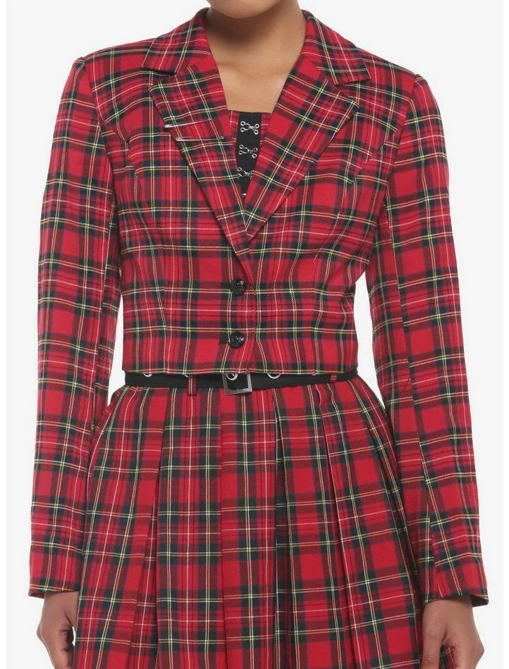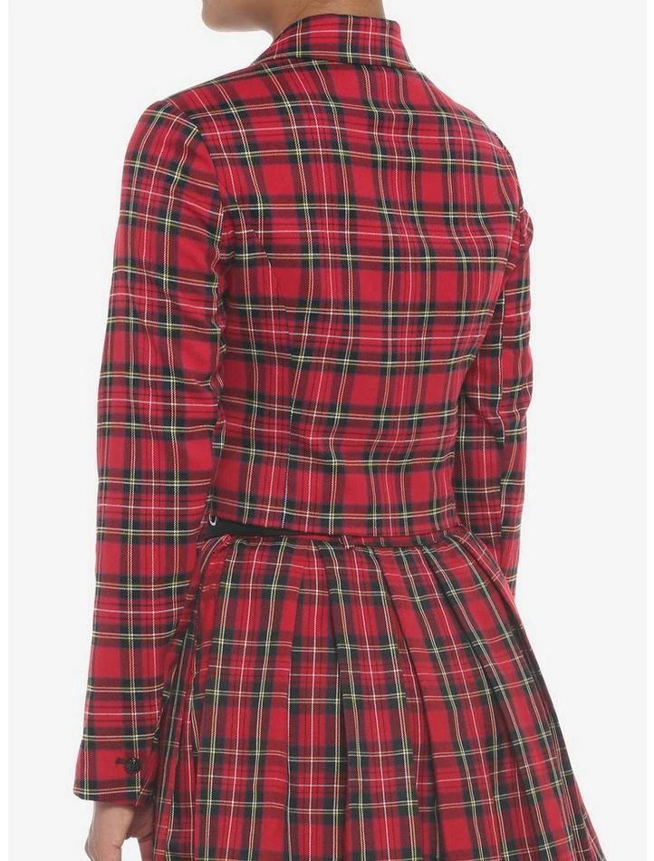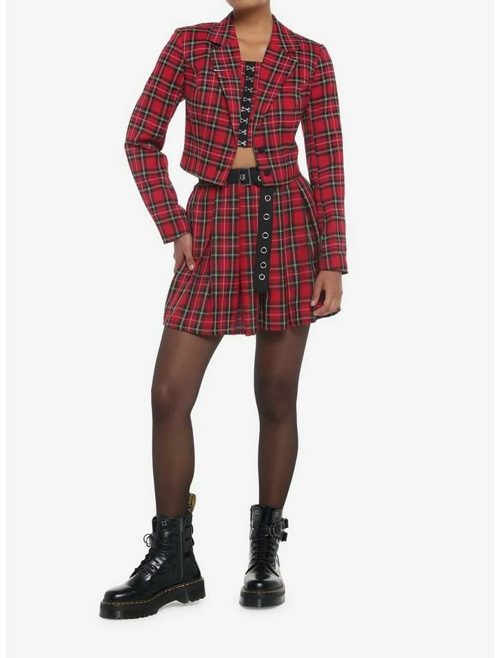 What happens when you mix punk and prep? This blazer is born! Add a statement piece to your wardrobe with this cropped blazer, featuring a red plaid pattern with safety pin detailing at the notched collar. Comes with skulls embossed on the buttons and padded shoulders.
