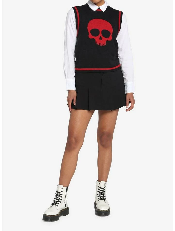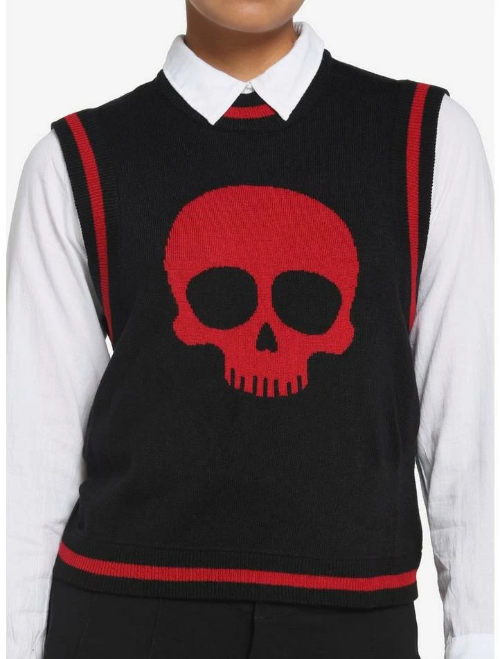 There’s no denying you’re a bone-a fide baddie in this black sweater vest! Featuring a red skull in the center and red contrast stripe detailing on the trimming.ย