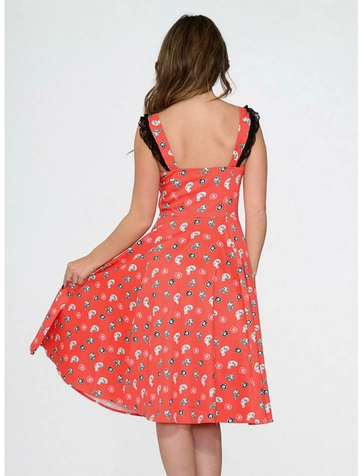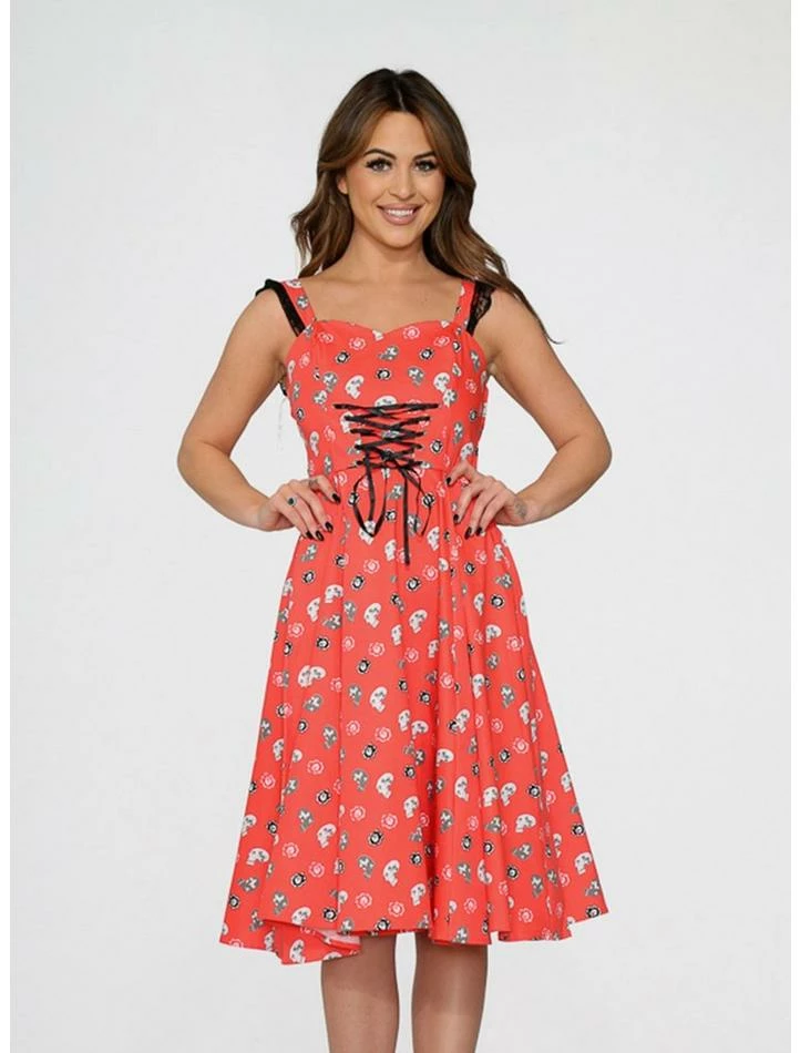 Skulls and retro? Two of our favorite things! This dress is printed all over with skulls. Featuring a waist flattering lace up detail and delicate lace at the sleeves.