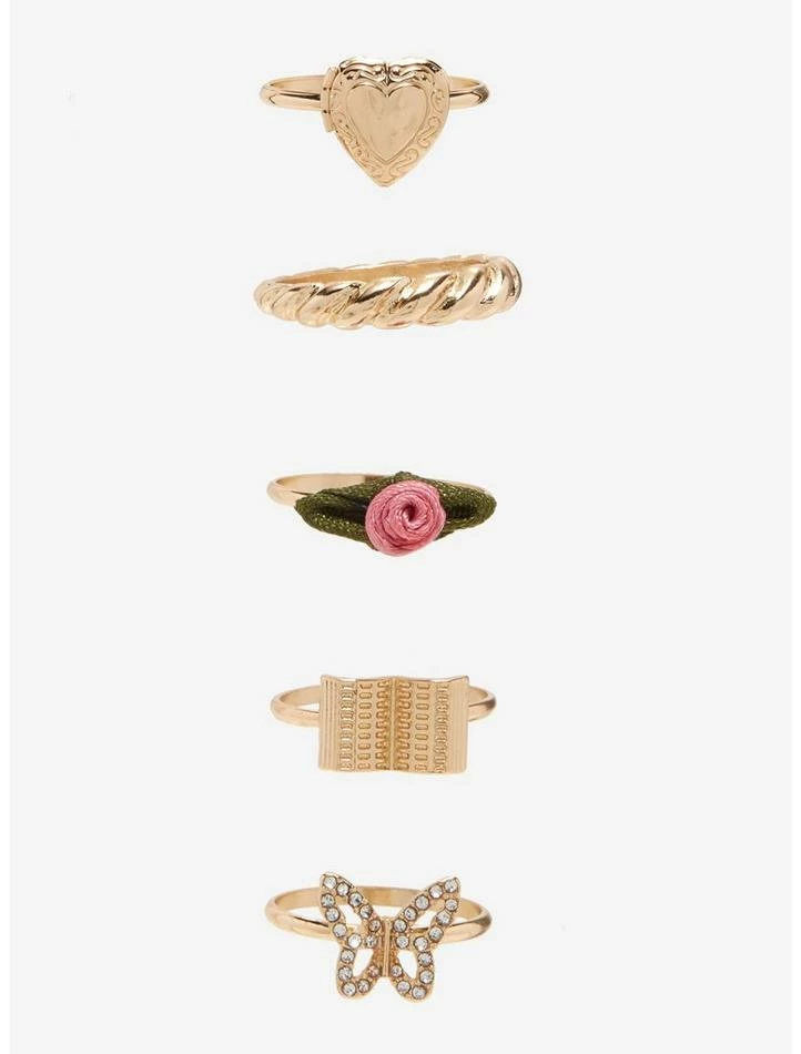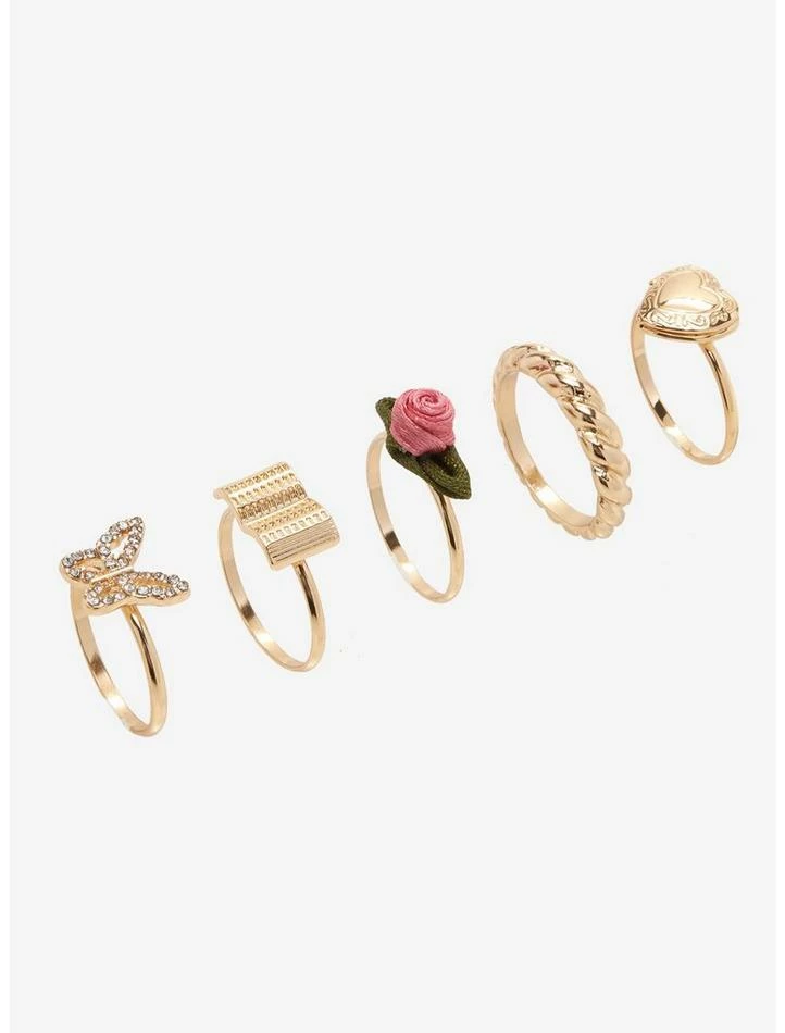 Complete your sweet academia look with the cutest accessories. This gold-tone set features heart, book, and butterfly detailing, with a statement ring highlighting a rose and leaves.