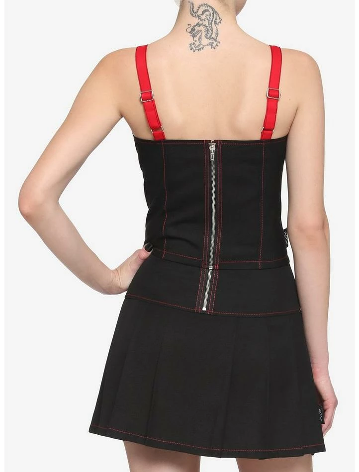 Need a punk ‘fit perfect for summer? We gotchu! This cropped cami features red contrast stitching on the princess seams, red strap detailing and a silver-tone chain accent on the chest. Comes with adjustable straps and a back zipper closure. Pair it with the matching skirt to complete your look!